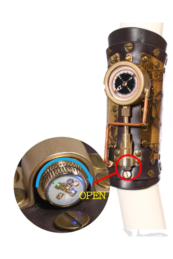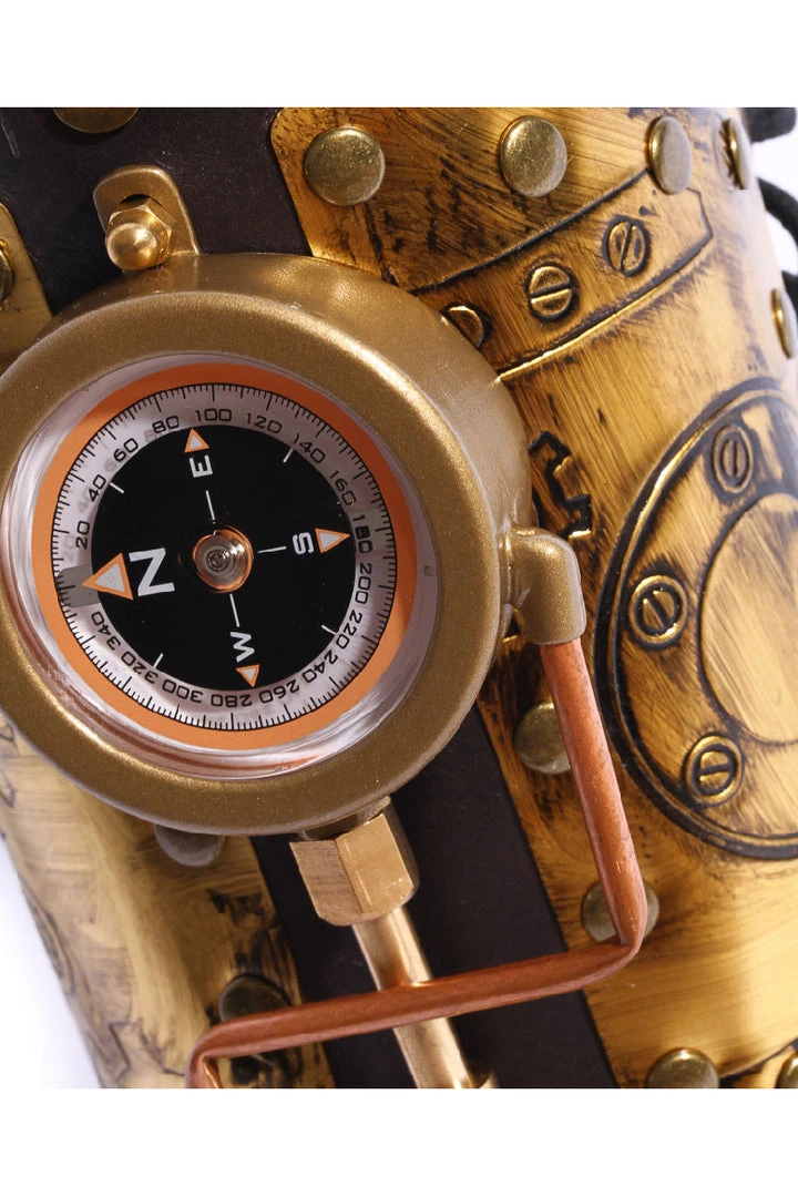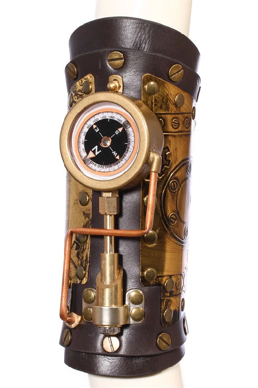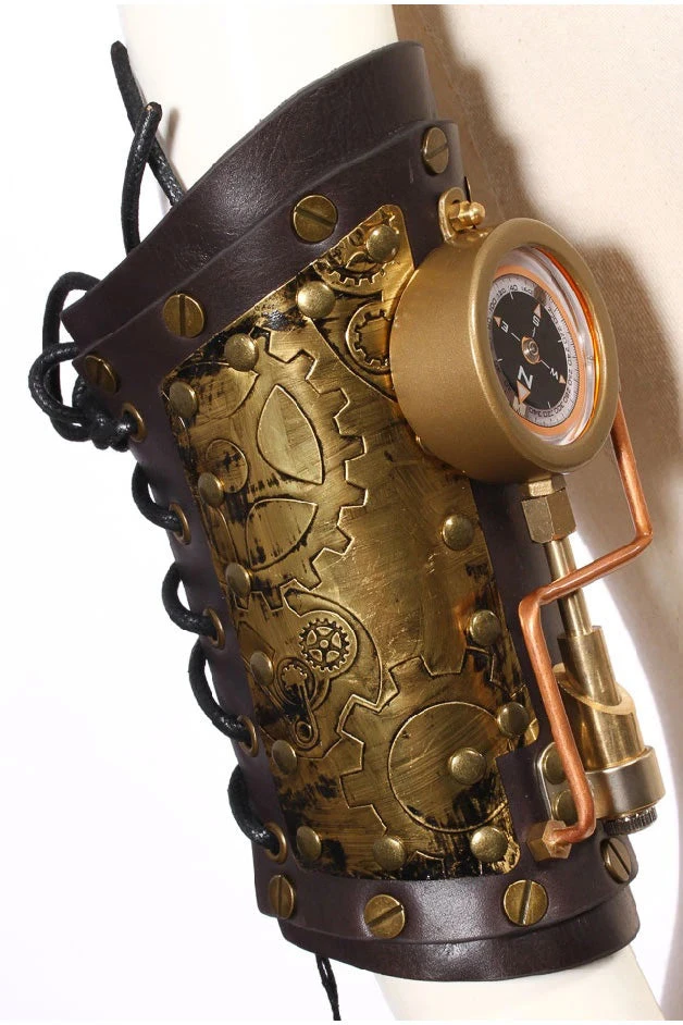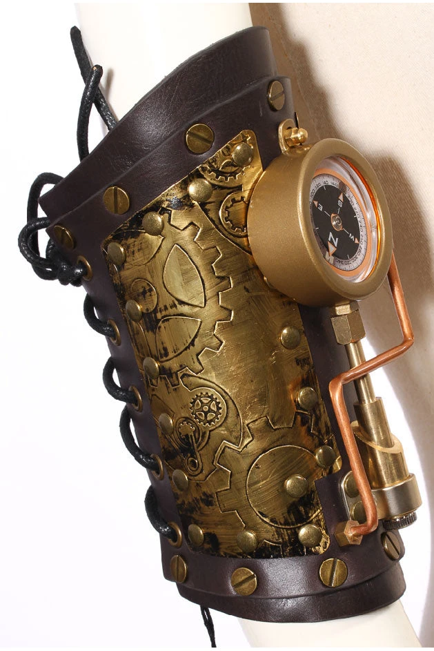 This fabulous Lace up arm gauntlet has a centrepiece of a working compass, it also has striking tube detail and copper cog embossed panels. Very well shaped and solidly riveted perfect for any Steampunk Adventure.
