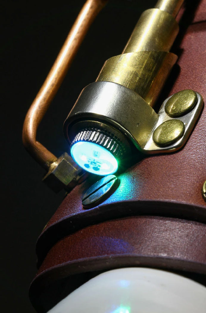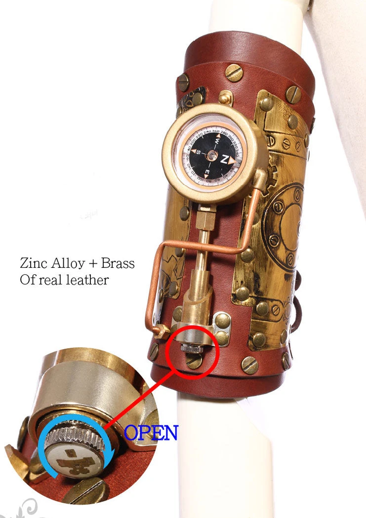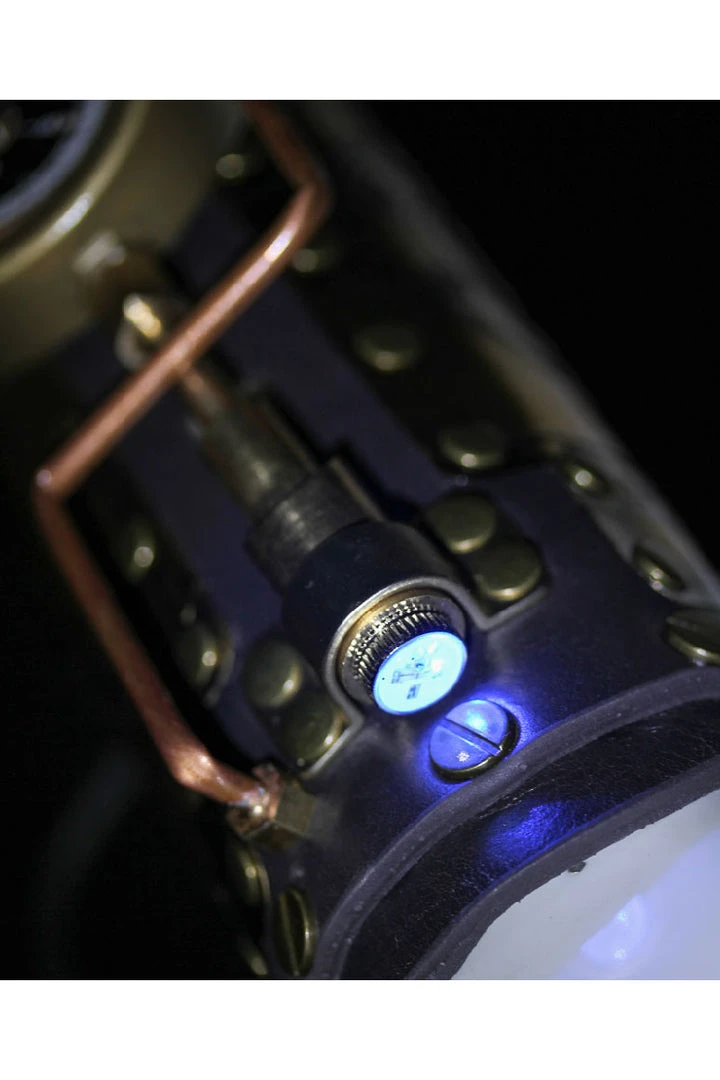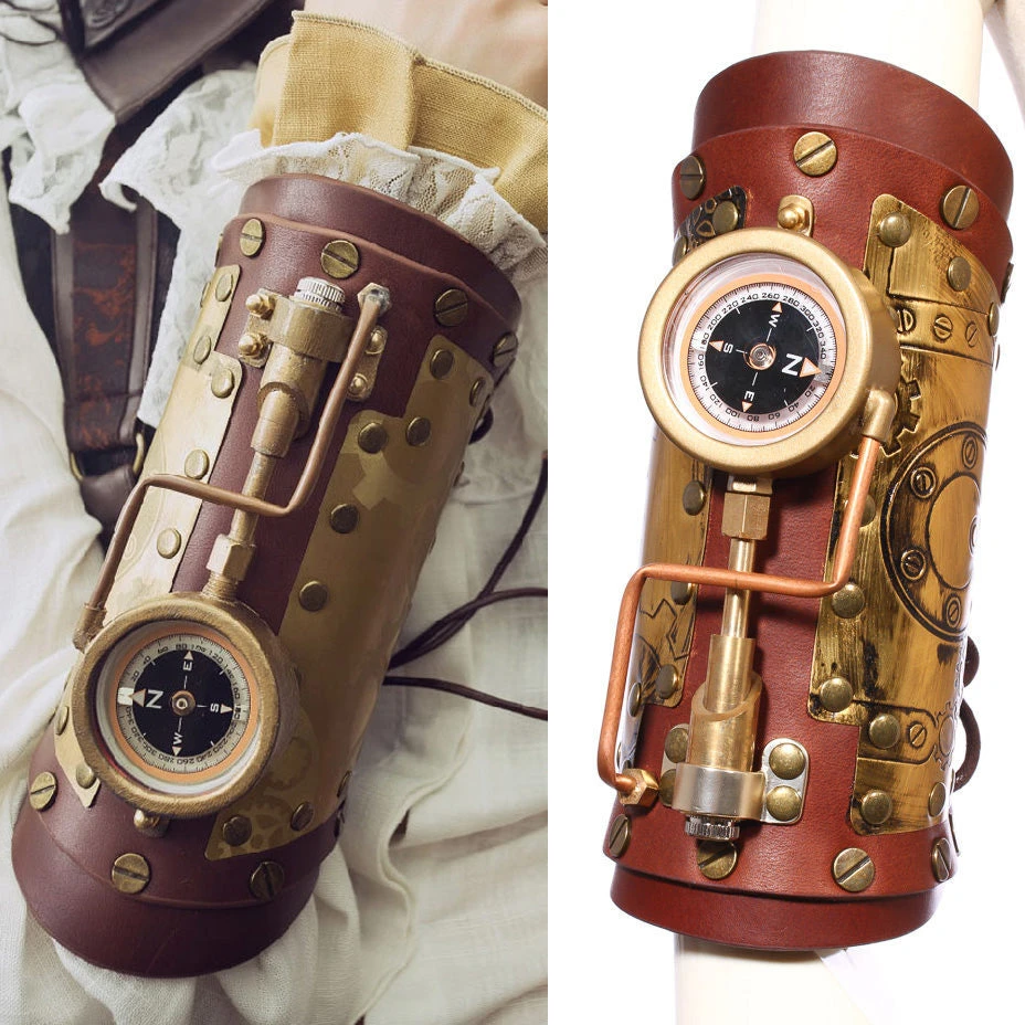 This fabulous Lace up arm gauntlet has a centrepiece of a working compass, it also has striking tube detail and copper cog embossed panels. Very well shaped and solidly riveted perfect for any Steampunk Adventure.
