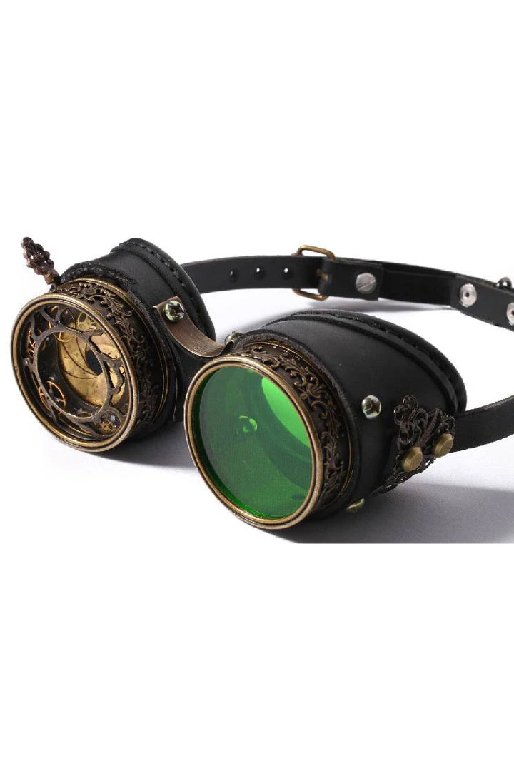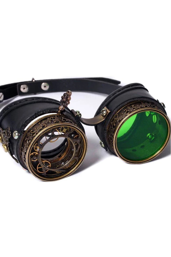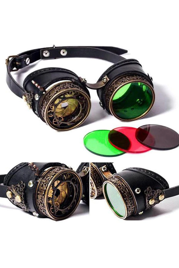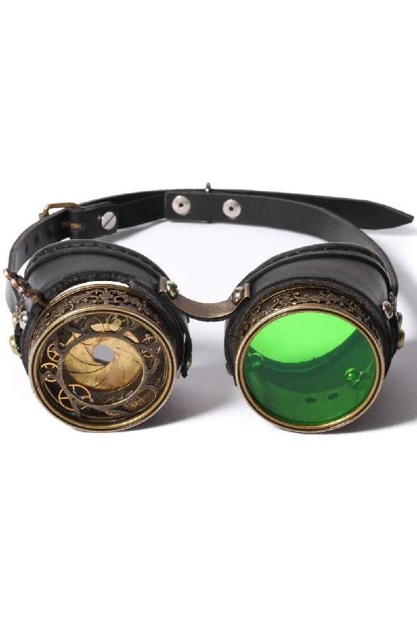 There is a functioning lever at the top of the left hand side of the glasses which allows you to adjust how much you see out of that eye, (the gold spiralling metal concertinas in and out) supplied with fitted Green Lens but also comes with additional lenses as pictured. Fantastic finishing touch For any Victorian Steampunk, Gothic or Sci Fi Outfit!