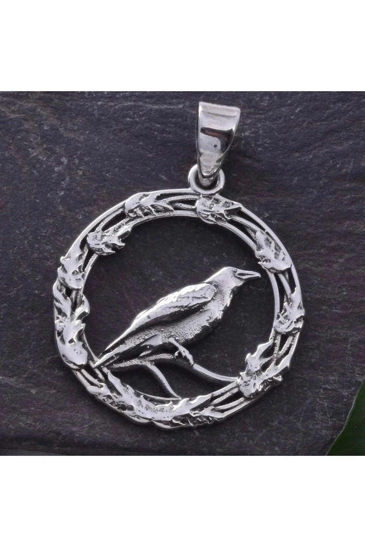 925 Silver Raven in Oak Leaf Ring Pendant.