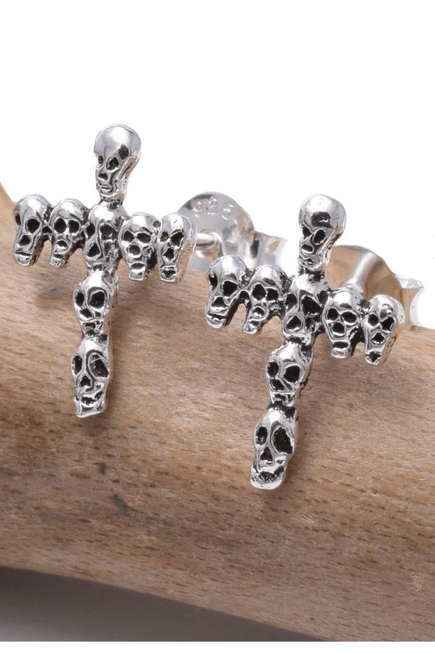 Seventh Sense 925 Silver Cross with Skulls Stud Earrings.