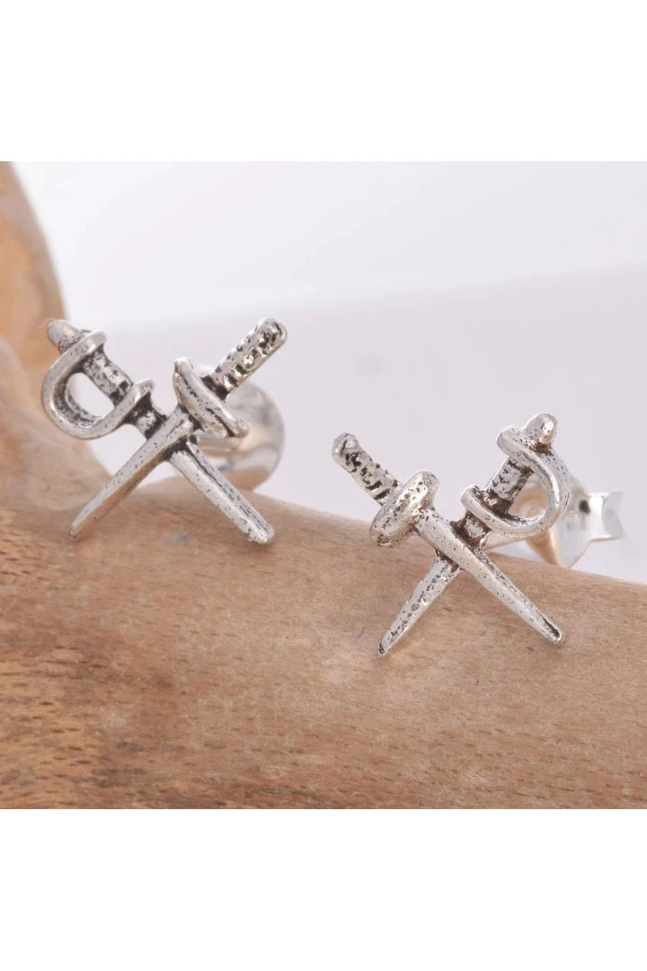 A subtle pair of tiny 925 Sterling Silver Crossed Cutlass Pirate Sword Stud earrings with butterfly backs.