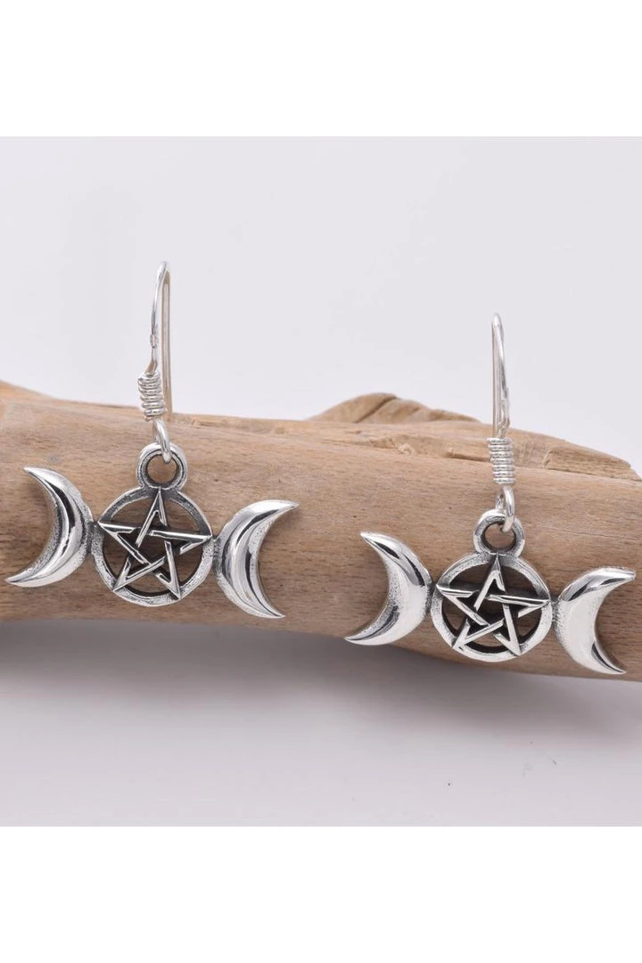 Sterling Silver triple moon pentagram earrings.