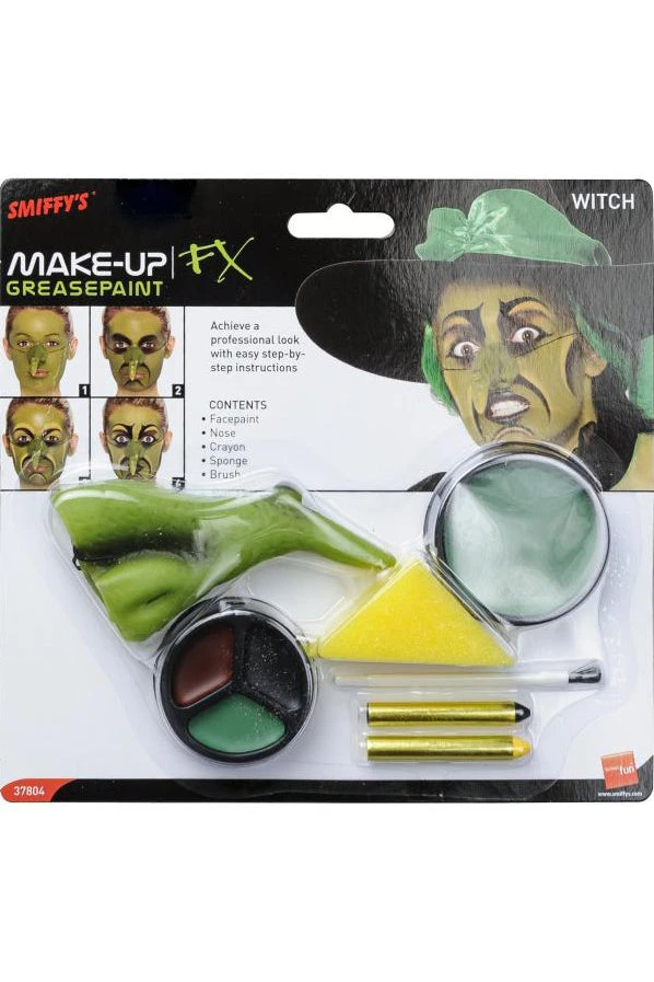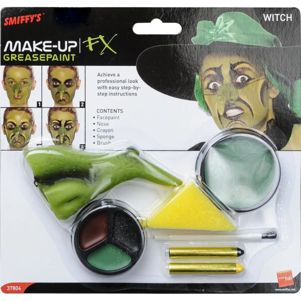 Dressing as a Witch for Halloween? Complete your Witch fancy dress costume with this complete Special Effects Kit. Included is Facepaints, Green Nose, Crayons, Sponge and Brushes.