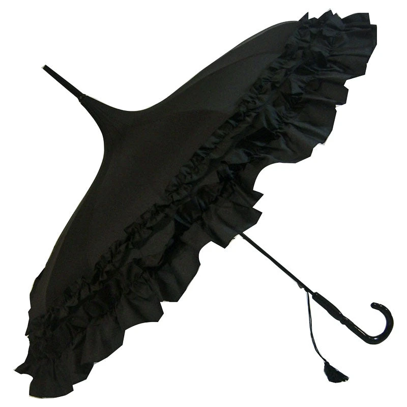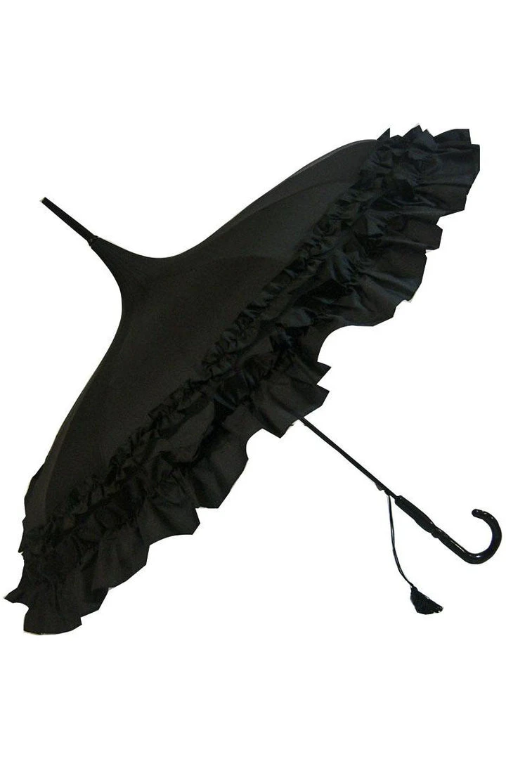Black Classic Frilled Pagoda Umbrella, Gothic Parasol. Black Victorian Gothic Rain Umbrella.