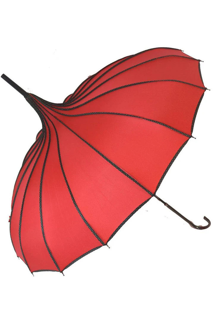 Red Ribbed Pagoda Umbrella, Gothic Parasol. Red Victorian Gothic Rain Umbrella.
