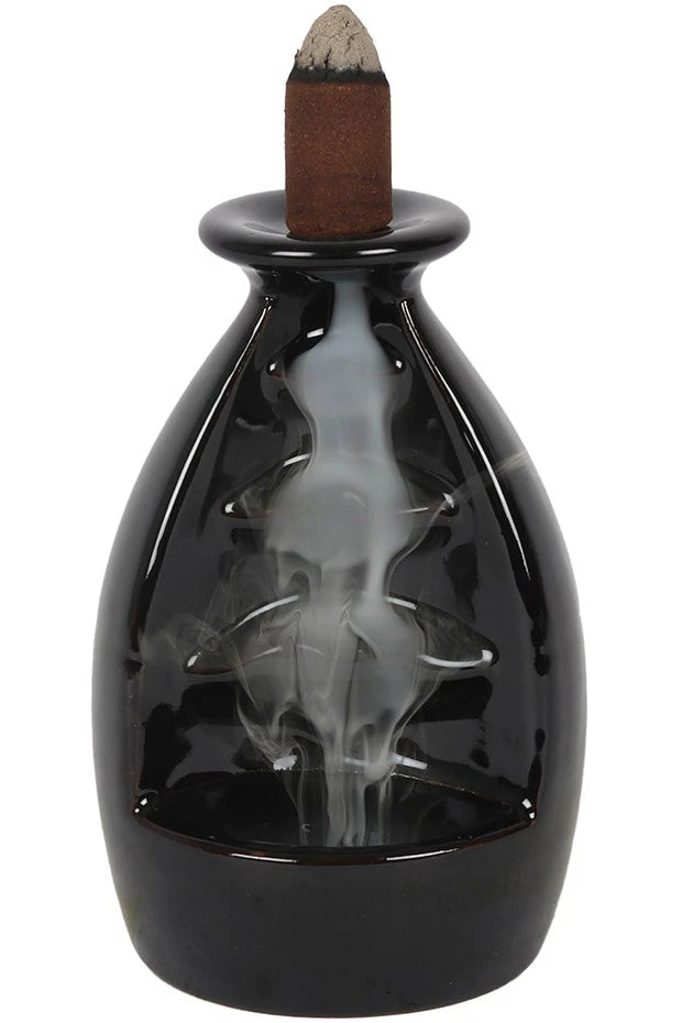 A black ceramic backflow incense burner with a rounded cocoon design. When a backflow cone is placed on top, smoke gently falls across a series of small tiers and pools below.