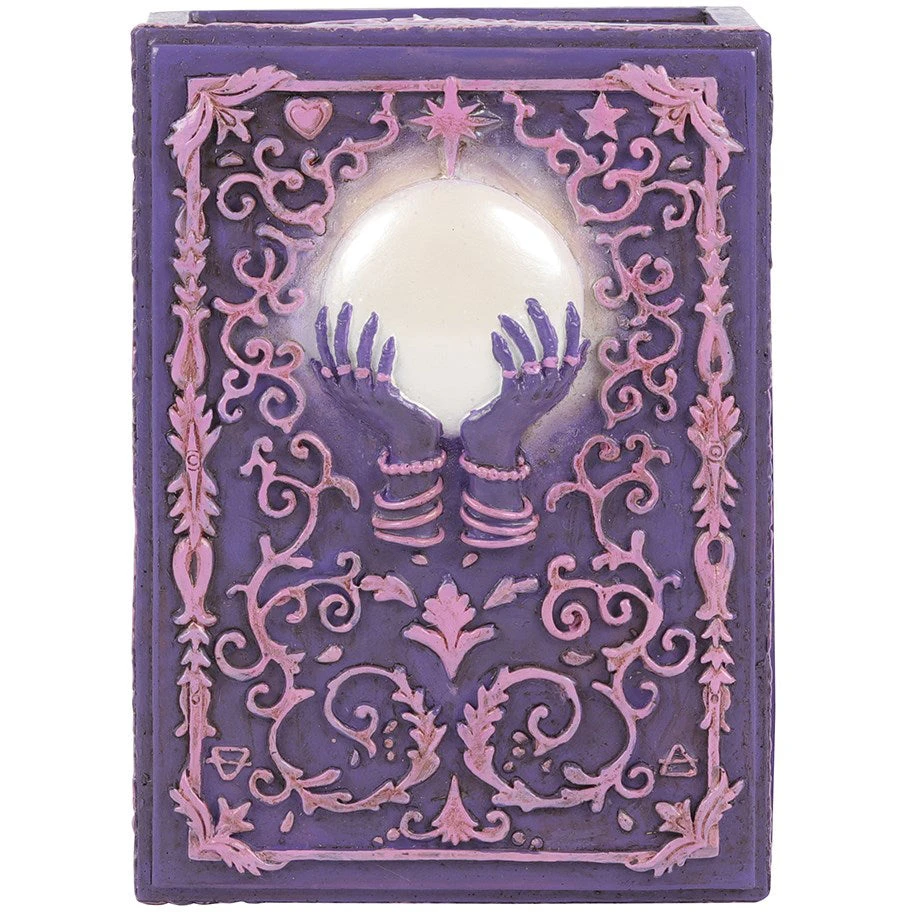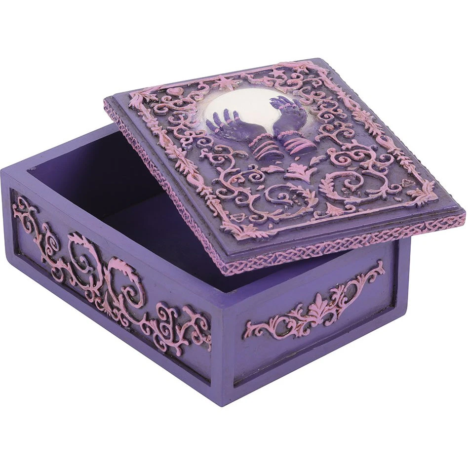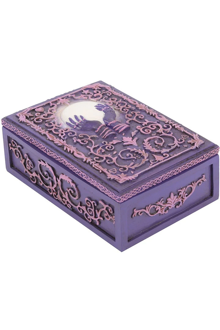A resin box with raised filigree details and a mystical hand and crystal ball design in the center. This pink and purple style is perfect for holding small tarot card decks, crystals, herbs and other small objects for safe keeping.
