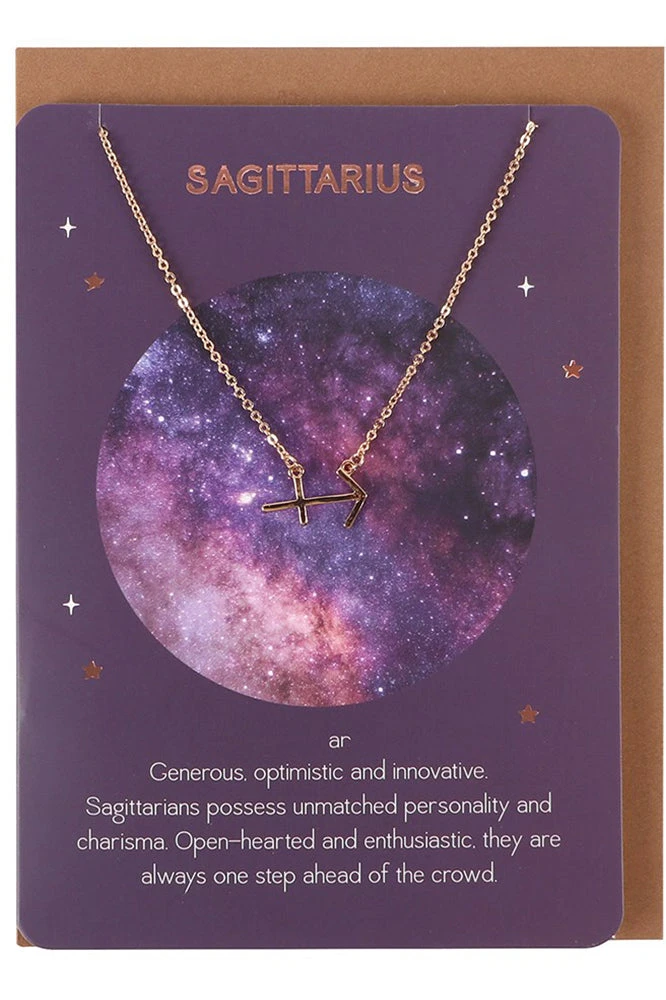 A gold-tone zodiac necklace beautifully presented on a matching greeting card that’s perfect for every Sagittarius. Part of the Written in the Stars range of celestial gifts and homeware. 22cm chain with lobster clasp closure. Nickel-free stainless steel. Includes envelope. Card left blank inside.