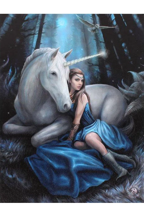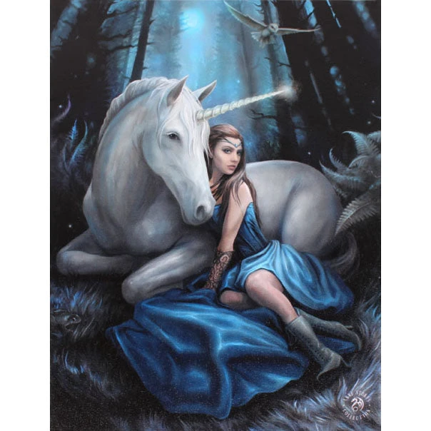 Blue Moon Gothic Unicorn Print with design by Anne Stokes featuring an elven lady in a corset dress sitting with a white unicorn.