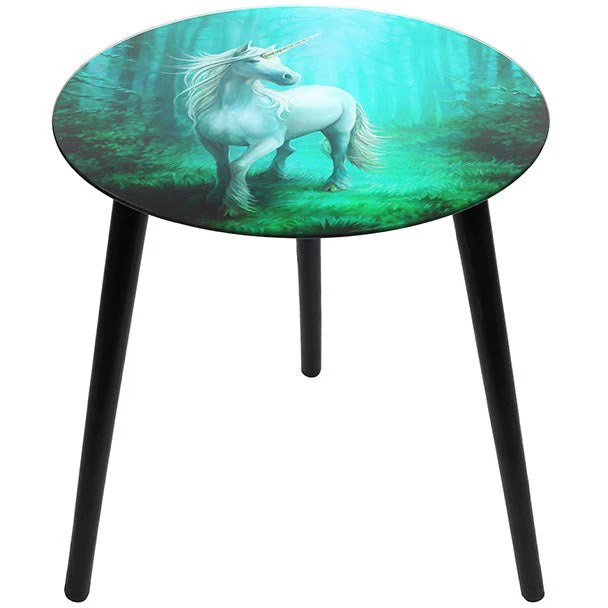 Stunning glass table featuring the popular ‘Forest Unicorn’ design by Anne Stokes. The glass design captures all the vivid colours of this bestselling unicorn artwork so this table is sure to be a real focal point in the home. The legs of this table are made from wood and finished in black.