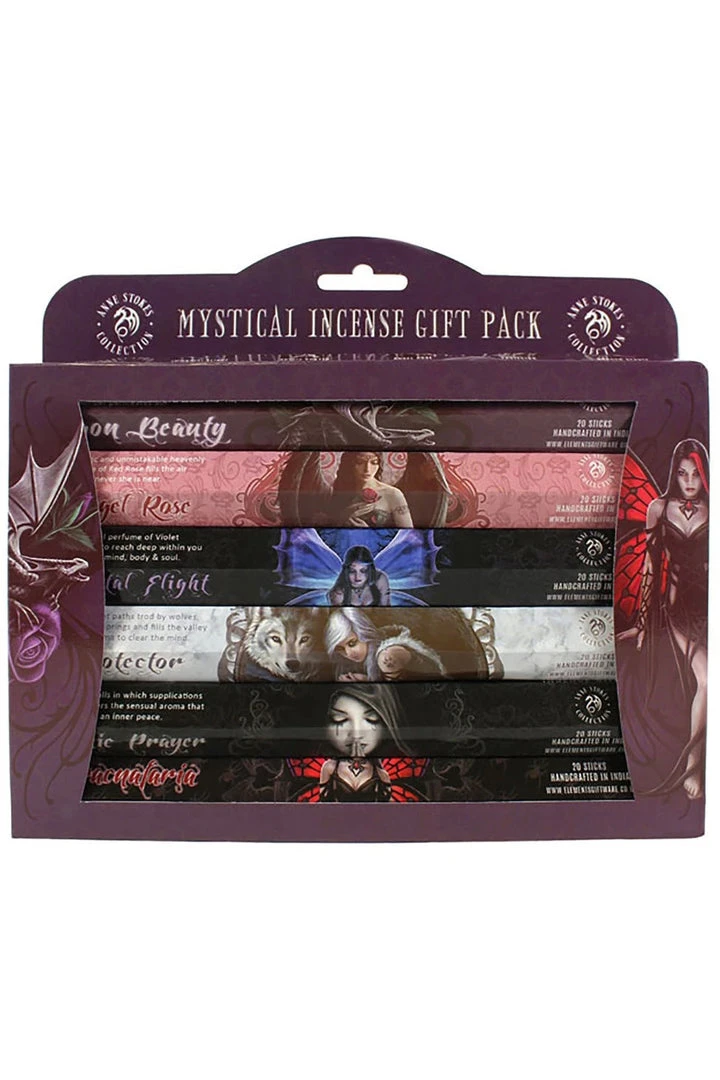A gift pack from the Mystical Anne Stokes incense range. It includes one hexagonal pack of each Mystical incense, six in total. It includes Gothic Prayer, Dragon Beauty, Angel Rose, Aracnafaria, Protector and Immortal Flight. Each hexagonal pack contains 20 sticks of incense that will fill your home with mystical scents.