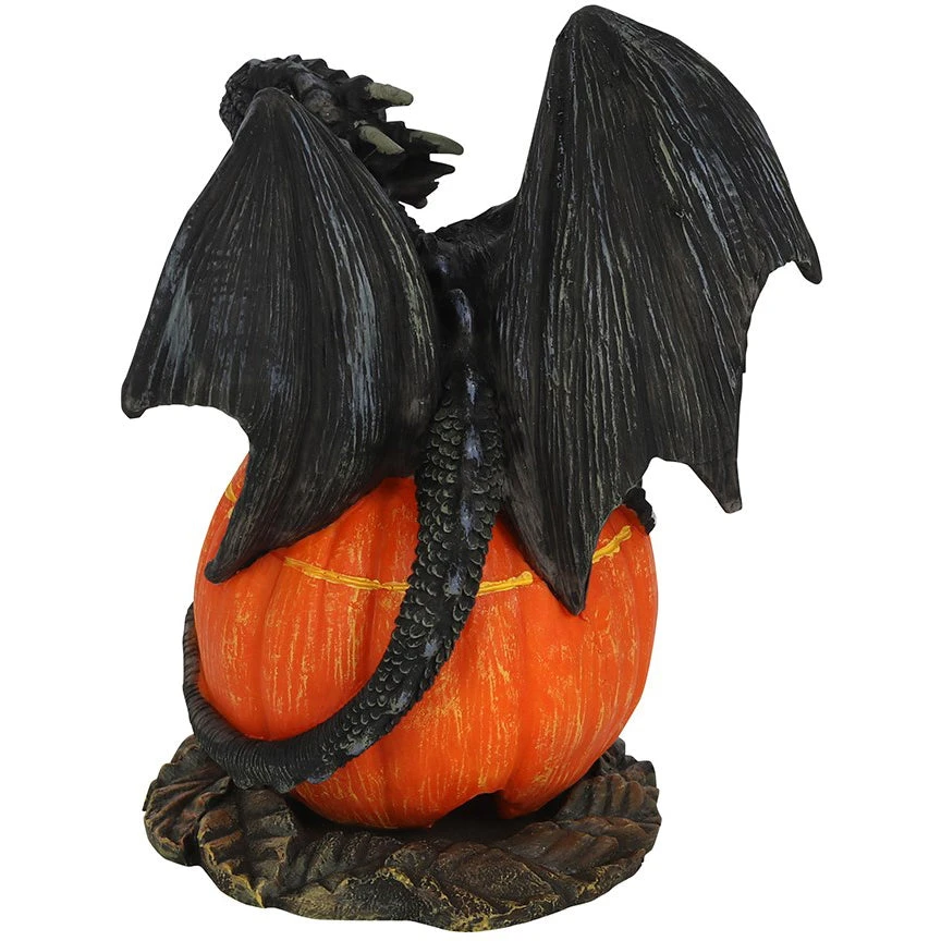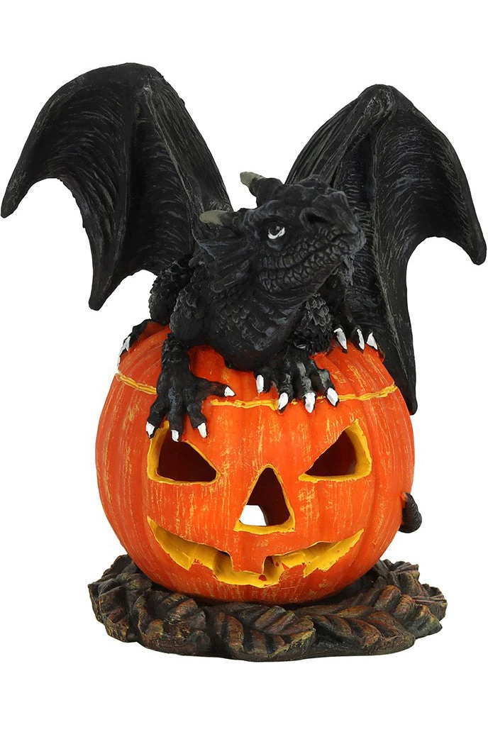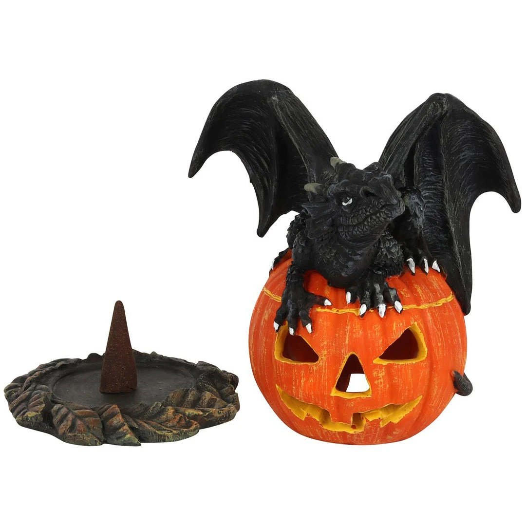 Designed by Anne Stokes, this eyecatching incense cone burner features a cute, black dragon sitting on top of a jack-o-lantern. When an incense cone is lit and placed inside the smoke from the cone will flow through the smiling pumpkin for an impressive feature piece.