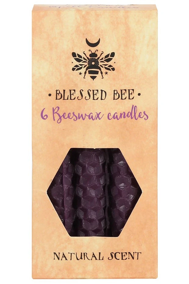A box of 6 purple Blessed Bee beeswax candles useful for spellwork involving prosperity and overcoming obstacles. Light, natural scent. Approximate burn time of 1 hour.