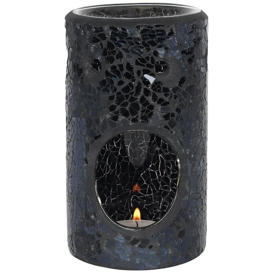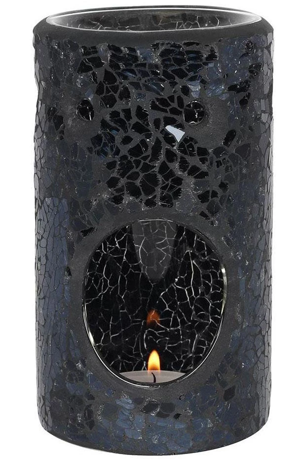 Stunning pillar shaped oil burner with a black mirrored crackle effect. Would look beautiful in any home. This item can also be used as a wax melt burner.