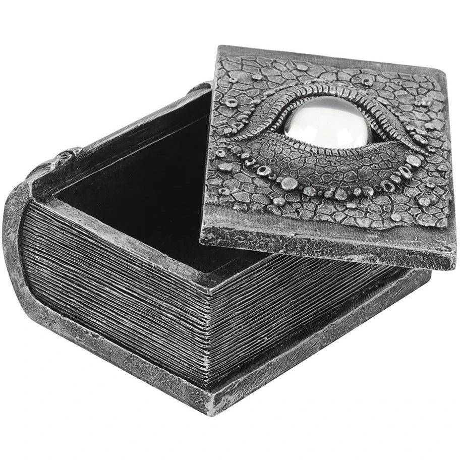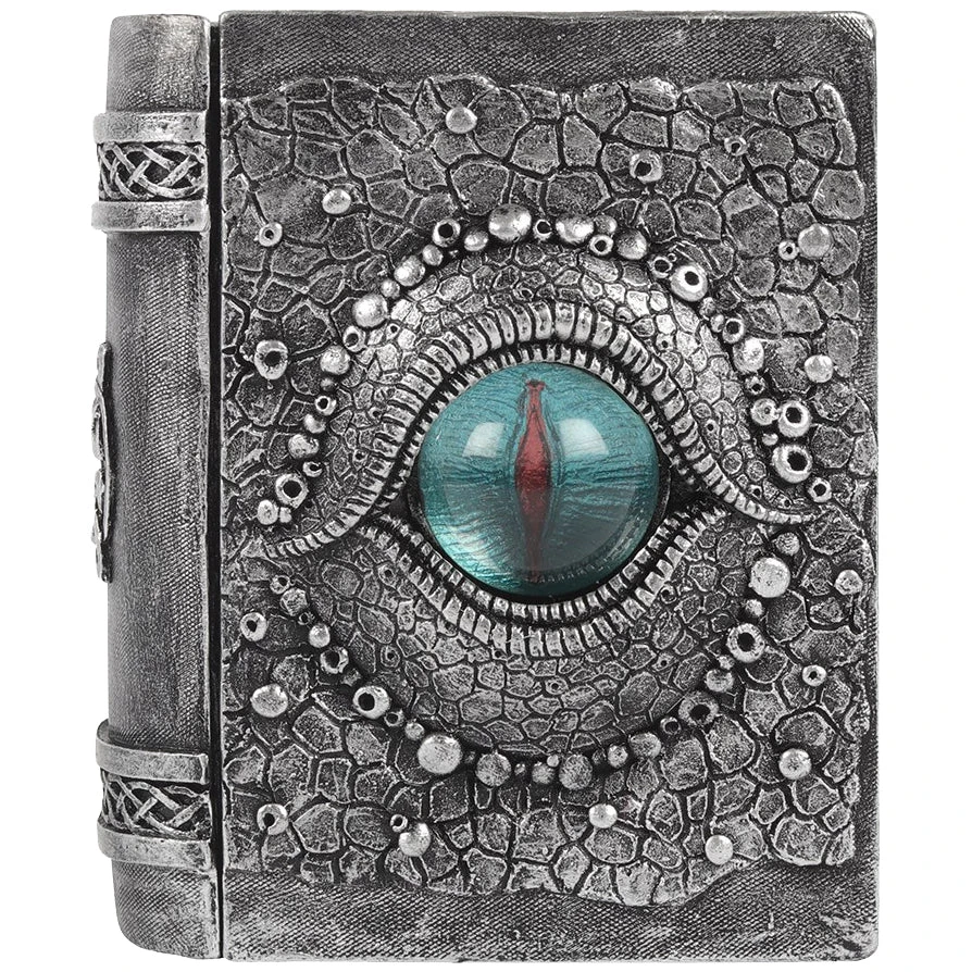 A resin, book-shaped box with raised dragon skin texture and a striking dragon eye in the center. This eyecatching style is perfect for holding small tarot card decks, crystals, herbs and other small objects for safe keeping.