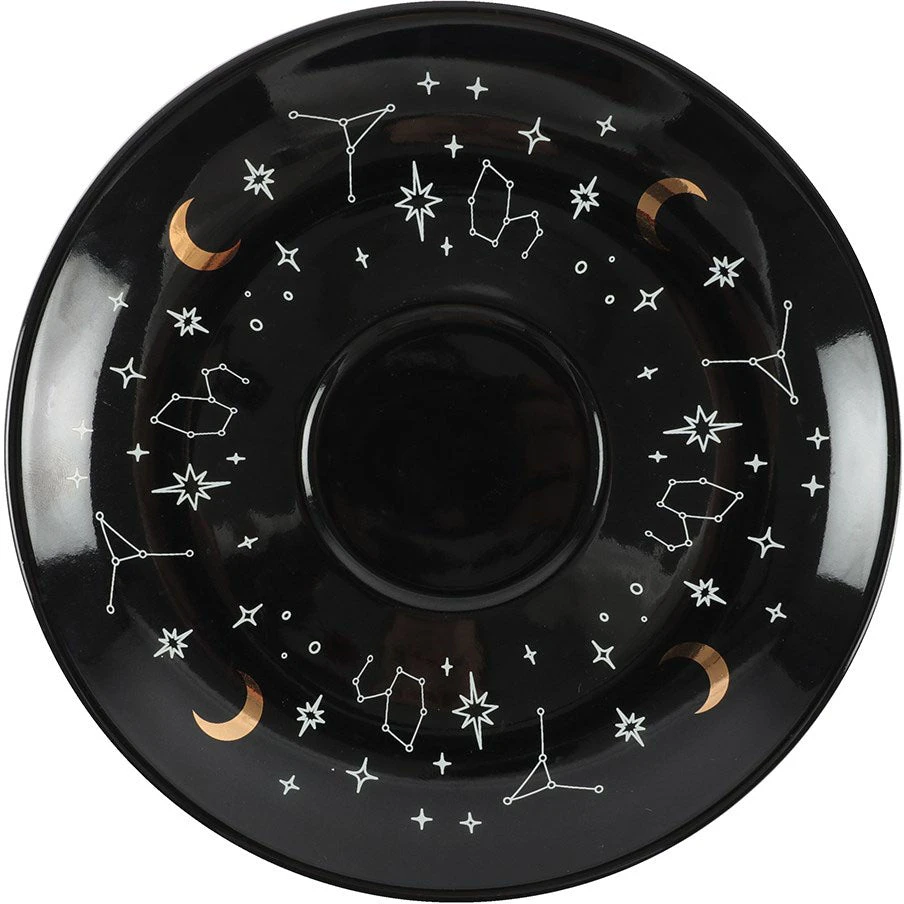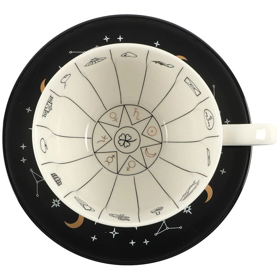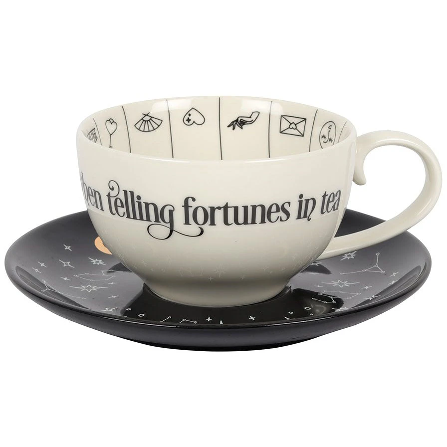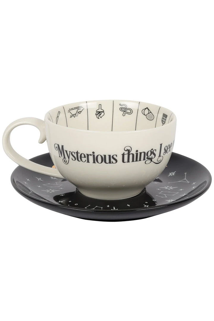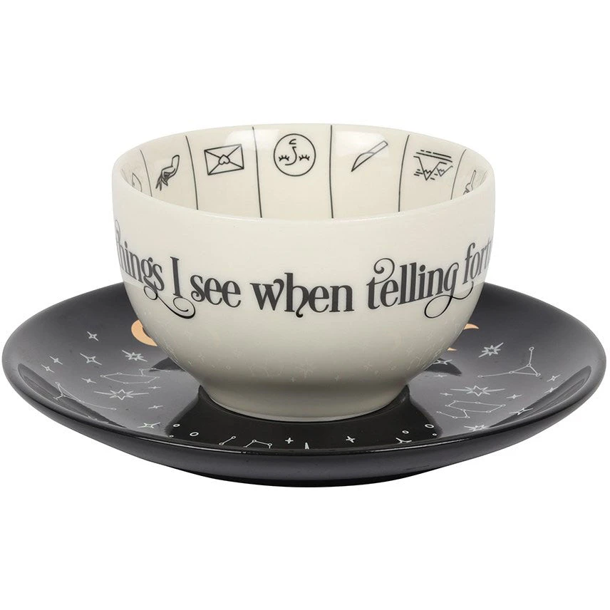 A stunning and unique tea cup to be used for reading tea leaves. Features a variety of fortune telling and astrological symbols accented by gold foil, a contrasting black saucer, and mystical ‘Mysterious things I see when telling fortunes in tea’ text. Truly a piece to be treasured.