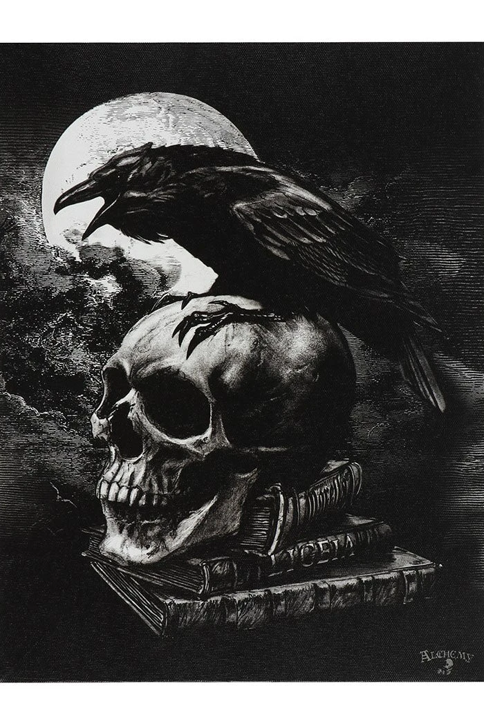 This small canvas plaque features ‘Poe’s Raven’ artwork by the popular Alchemy Gothic of London. A detailed raven sits atop a skull and pile of old books in this stunning, greyscale piece.