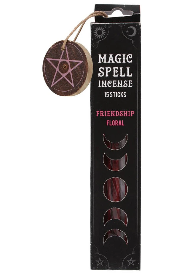 This box of magic spell incense includes 15 floral scented incense sticks and a matching wooden pentagram holder that is perfect for accompanying spells of friendship and understanding. Whether used for spellwork or everyday enjoyment, this fragrance will attract all things kind and nurturing. Please practice caution when burning and never leave lit incense unattended.