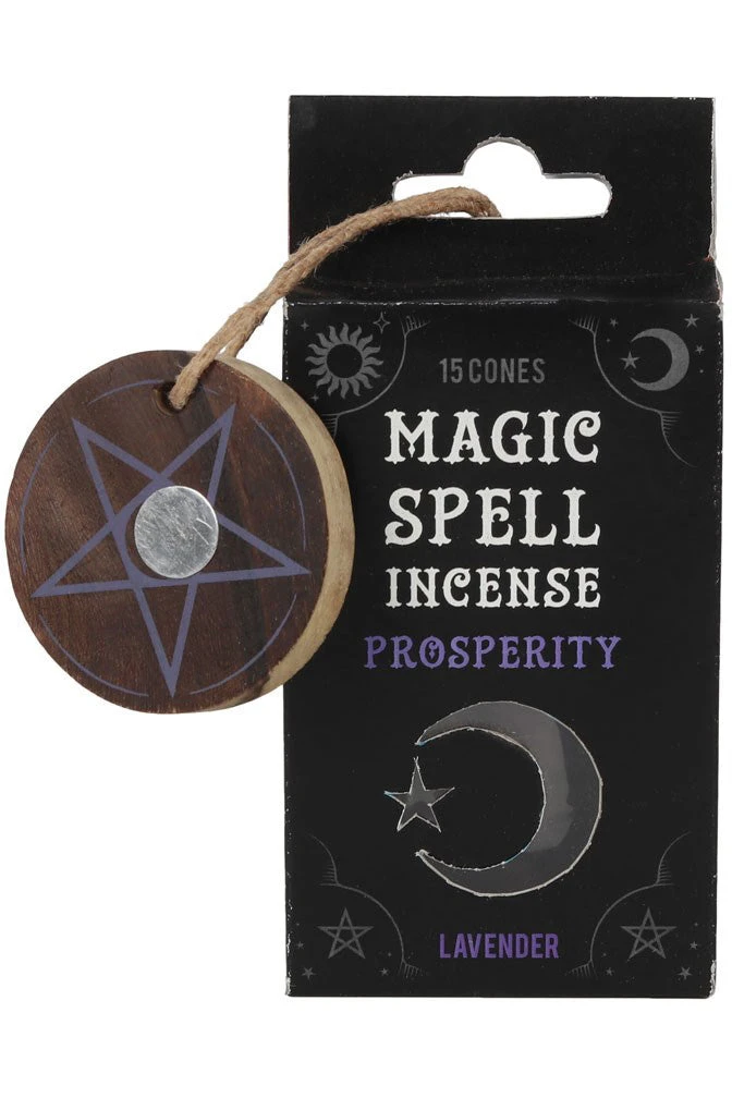 This box of magic spell incense includes 15 lavender scented incense cones and a matching wooden pentagram holder that is perfect for accompanying spells of growth and prosperity. Whether used for spellwork or everyday enjoyment, this fragrance will attract all kinds of success. Please practice caution when burning and never leave lit incense unattended.