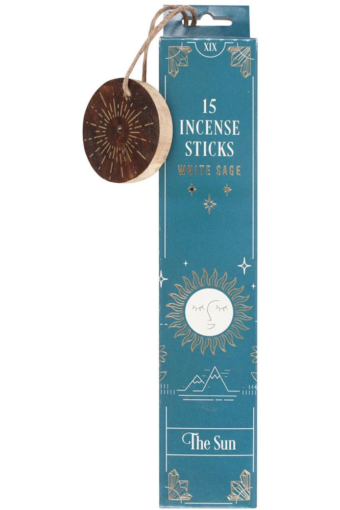 Inspired by traditional tarot card designs, this box of incense features a stunning sun tarot design and includes 15 incense sticks in a lovely white sage fragrance and a matching wooden holder. Please practice caution when burning and never leave lit incense unattended.