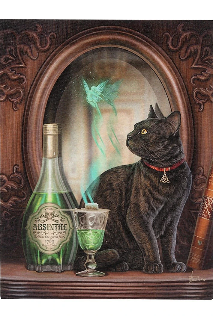 Lisa Parker bewitching Absinthe design with a black cat and tiny green fairy in flight.