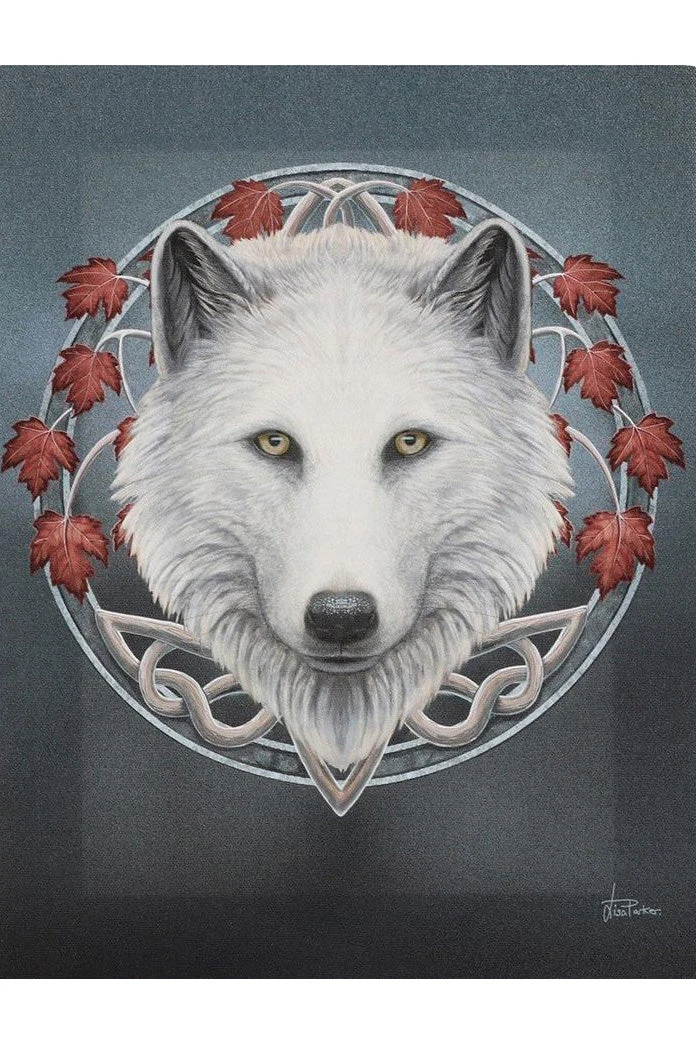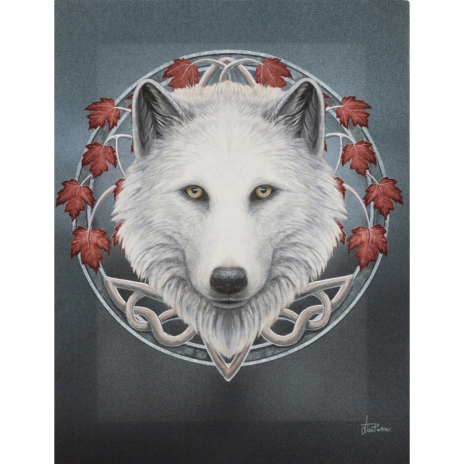A stunning canvas plaque featuring the ‘Guardian of the Fall’ white wolf design by Lisa Parker.