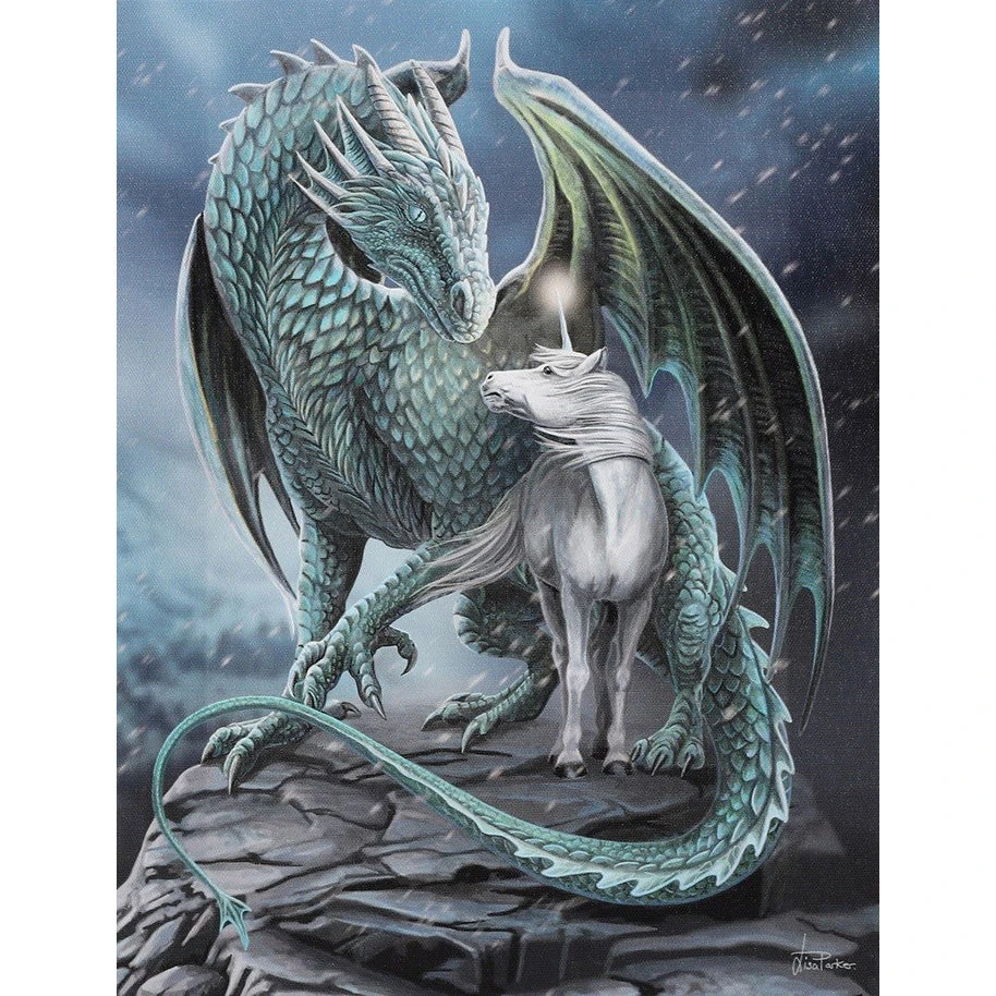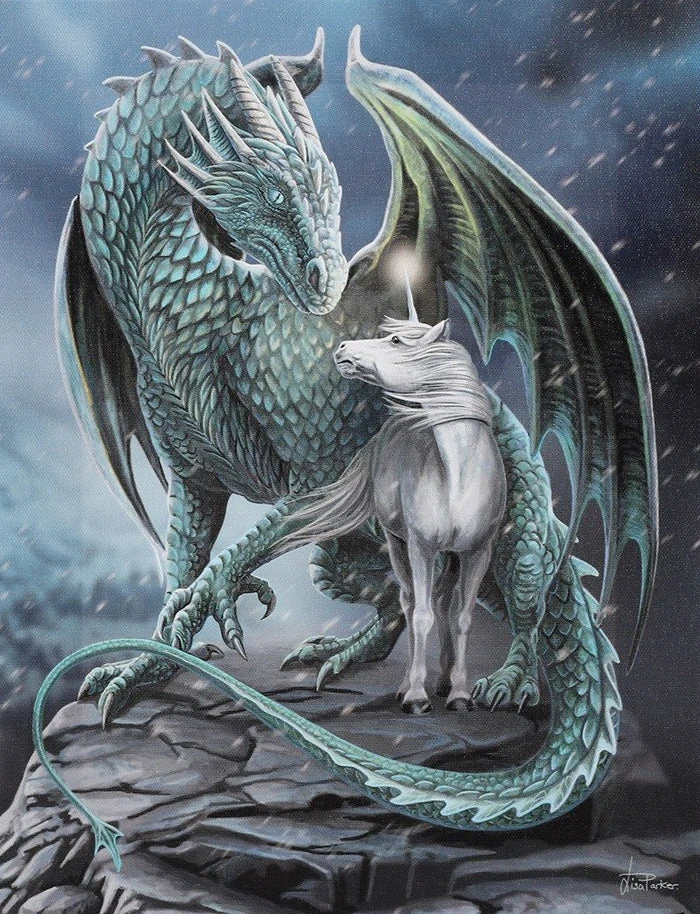 A captivating design by artist Lisa Parker depicting a dragon protecting a unicorn.