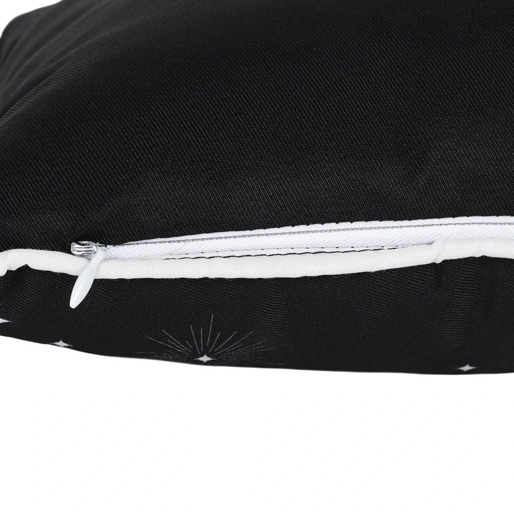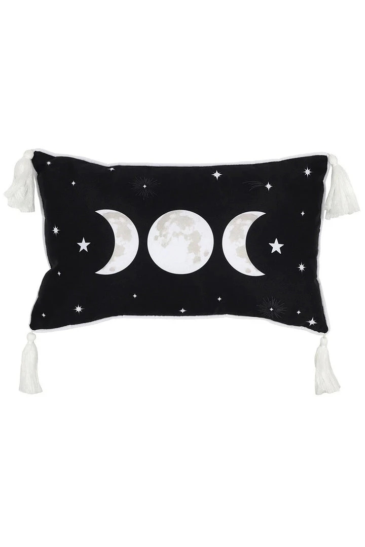 This lovely rectangular fabric cushion is black in colour with a white and grey triple moon design and white tassel accessory on each corner. Zip closure so inner can be removed.