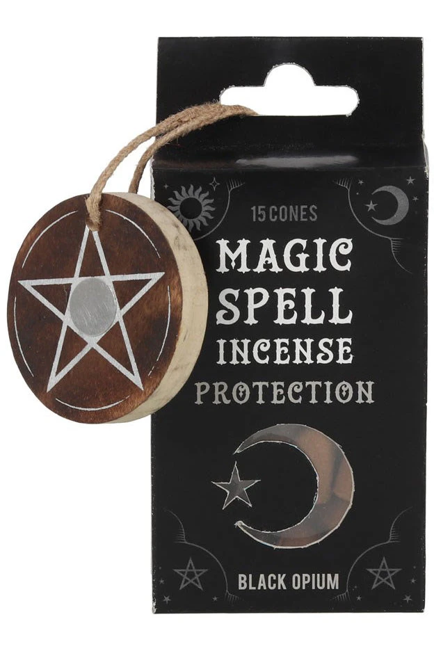 This box of magic spell incense includes 15 opium scented incense cones and a matching wooden pentagram holder that is perfect for accompanying spells of protection and guidance. Whether used for spellwork or everyday enjoyment, this fragrance will attract all things divine. Please practice caution when burning and never leave lit incense unattended.