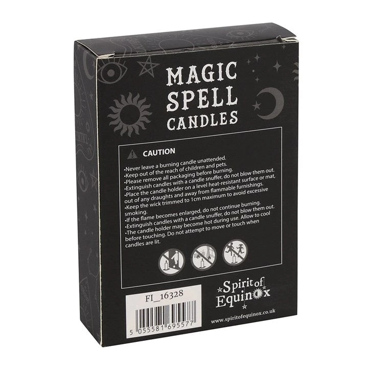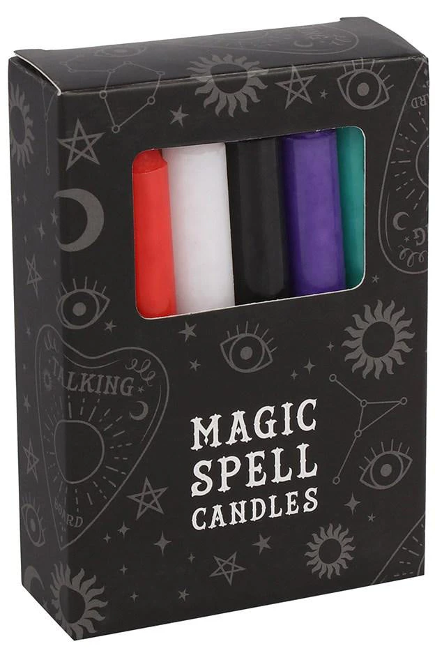 Pack of 12 mixed spell candles containing these colours; 2x black, 2x white, 1x purple, 1x dark blue, 1x light blue, 1x orange, 1x green, 1x red, 1x yellow and 1x pink candle. Candle magic is one of the simplest forms of spell casting in which the caster decides on a goal, visualises the end result and focuses intent or will to manifest that result. Typically a caster will write down their intent on a piece of paper the same colour as the candle and burn the paper in a fire safe bowl. The candle needs to be burned completely for the spell to be completed.