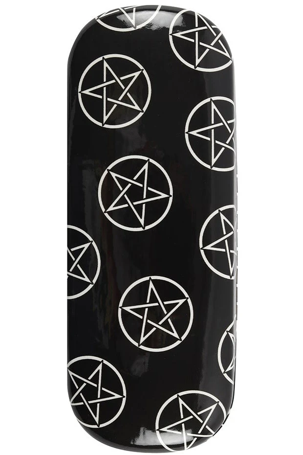 A black glasses case with an all-over pentagram pattern. The case also comes with a handy cloth for cleaning glasses.