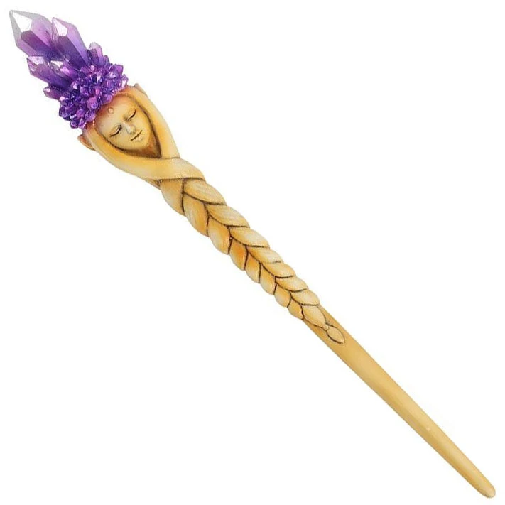 This stunning resin wand features a pearlescent, purple crystal cluster atop the head of a serene goddess. With a braided stem details and beautiful design, this wand is fit for a queen. Please note that this wand is not a toy and should be handled with care.