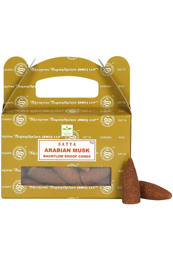 Beautifully scented Arabian Musk backflow incense cones developed by Satya. The cones are crafted using the highest quality ingredients to offer long lasting fragrance. Use these cones with a backflow incense burner to create stunning smoke displays.