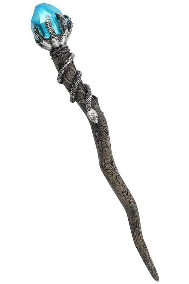 This 24cm resin wand features a moulded, pearlescent blue gem held by a silver claw. With a slithering snake and pentagram symbol carved into a treebranch-effect stem, this magic wand is a a necessity for any witch or wizard’s collection. This wand is not a toy and should be handled with care.