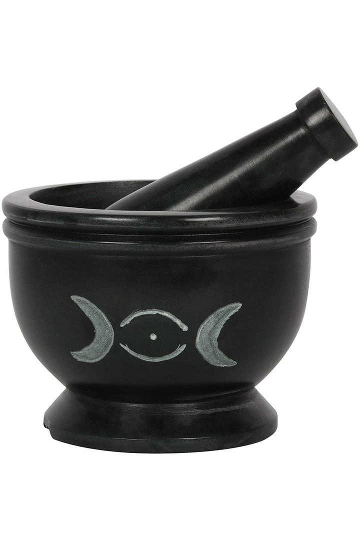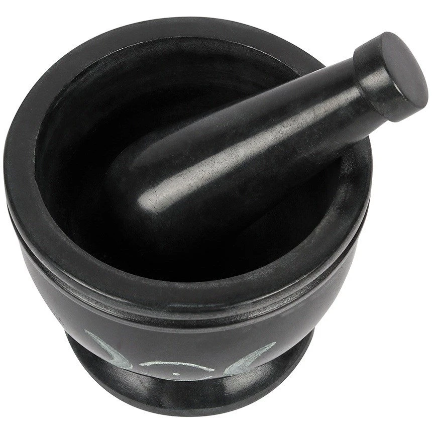 This carved soap stone mortar and pestle is an essential tool for crushing and grinding herbs in a variety of sacred rituals. This style is accented by a carved triple moon design on the side and is great for display or a witch’s kitchen.