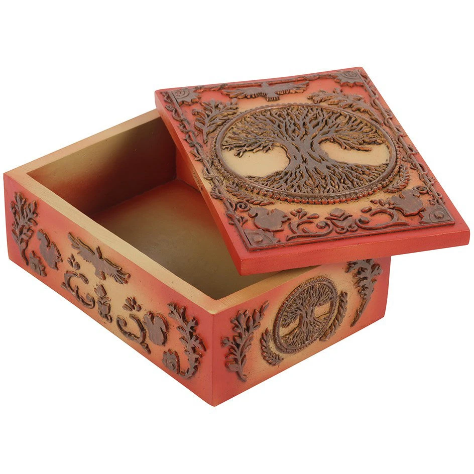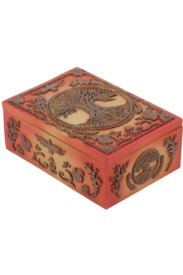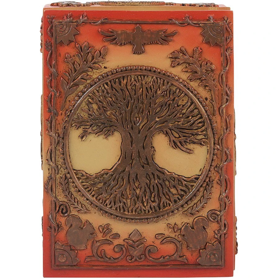 A resin box with raised woodland designs and a detailed Tree of Life in the center. This eyecatching style is perfect for holding small tarot card decks, crystals, herbs and other small objects for safe keeping.