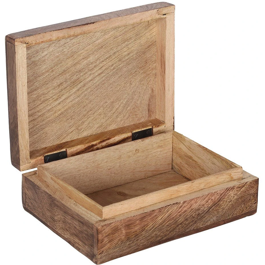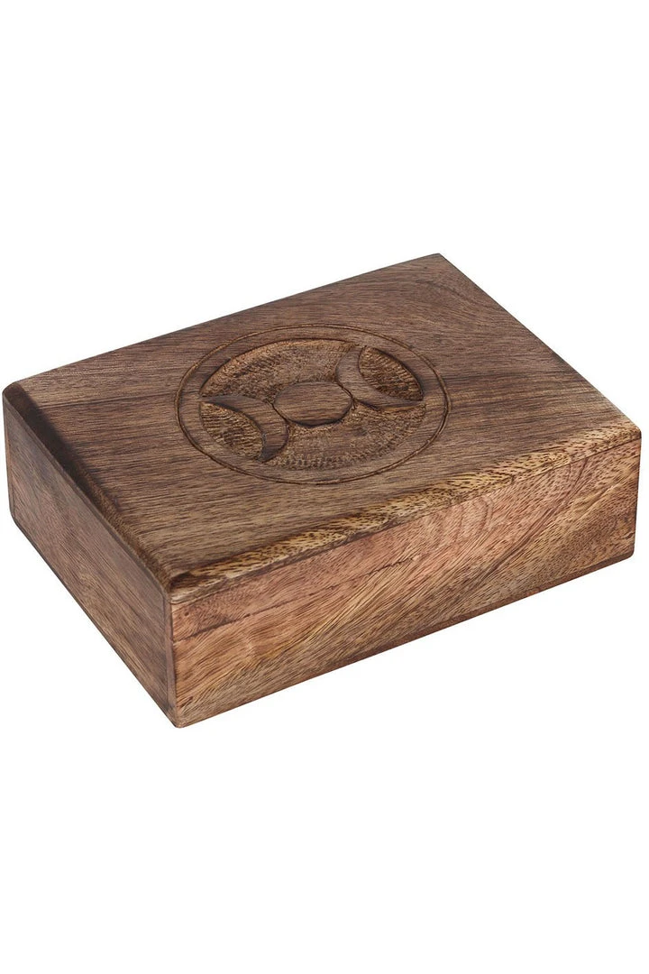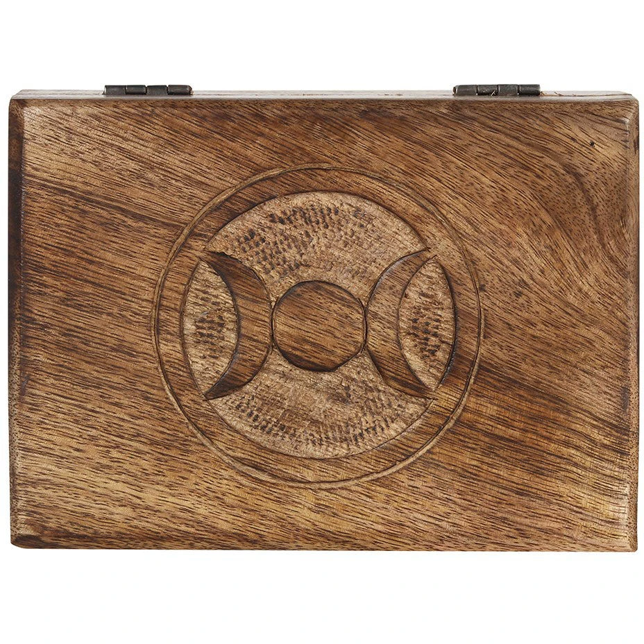 A hinged box made from mango wood featuring a hand carved triple moon design on the lid. This box is the perfect size for storing tarot cards, crystals and other magical objects.