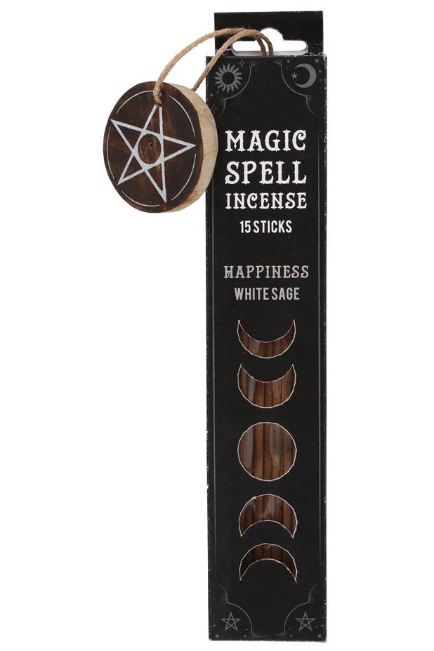 This box of magic spell incense includes 15 white sage scented incense sticks and a matching wooden pentagram holder that is perfect for accompanying spells of balance and happiness. Whether used for spellwork or everyday enjoyment, this fragrance will attract all the best things life has to offer. Please practice caution when burning and never leave lit incense unattended.