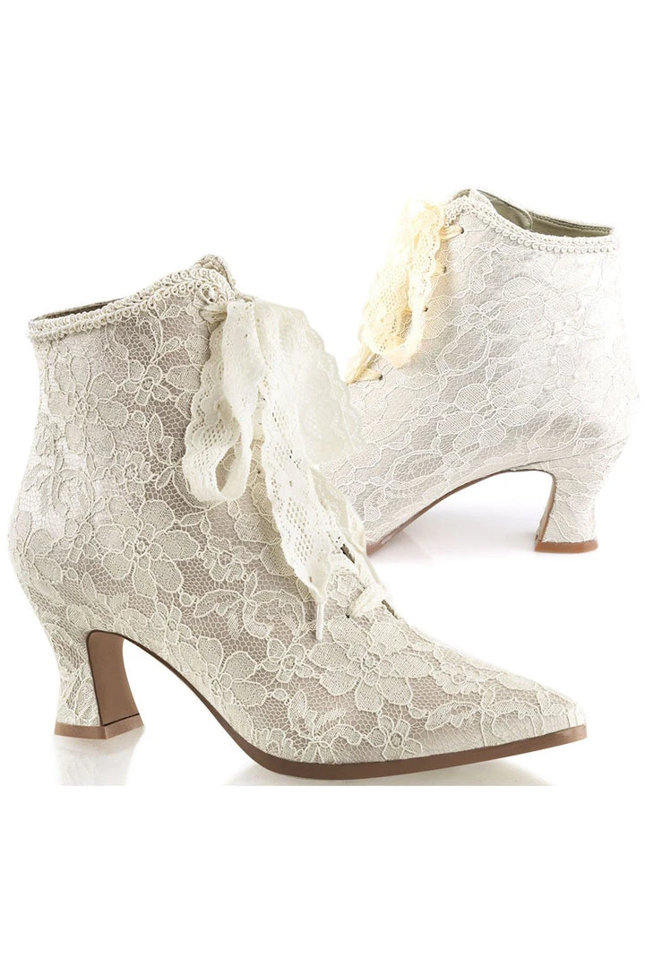 Fabulicious Victorian Boots. Champagne leather effect boots with lace overlay, 2.75 inch flared heel and ribbon bow tie. Victorian and Steampunk Boots.