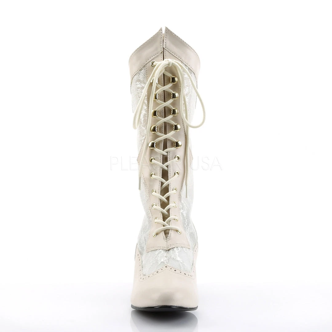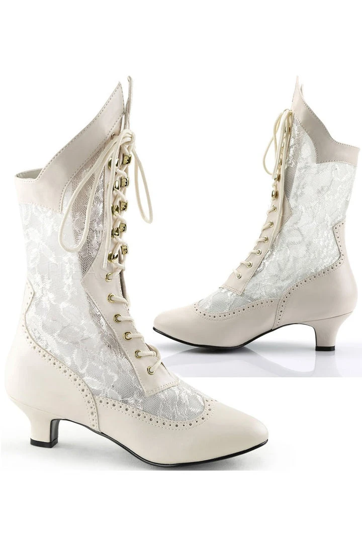 Funtasma Dame 115 Ivory Victorian Style Calf Boot with Lace panels. Calf Boots in leather effect with Lace panels, hook and eye front lacing and two inch heel.