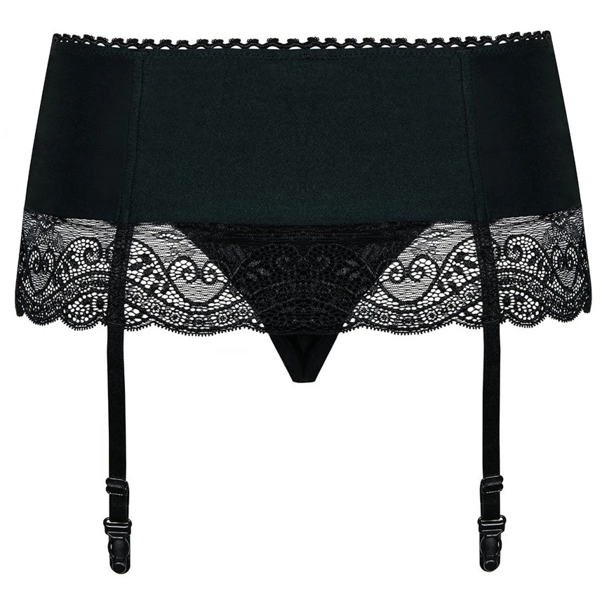 Classically erotic! Wide suspender belt in a material mix of stretch fabric and fine lace. The suspenders are adjustable. Plain black string included. Delivery without stockings.