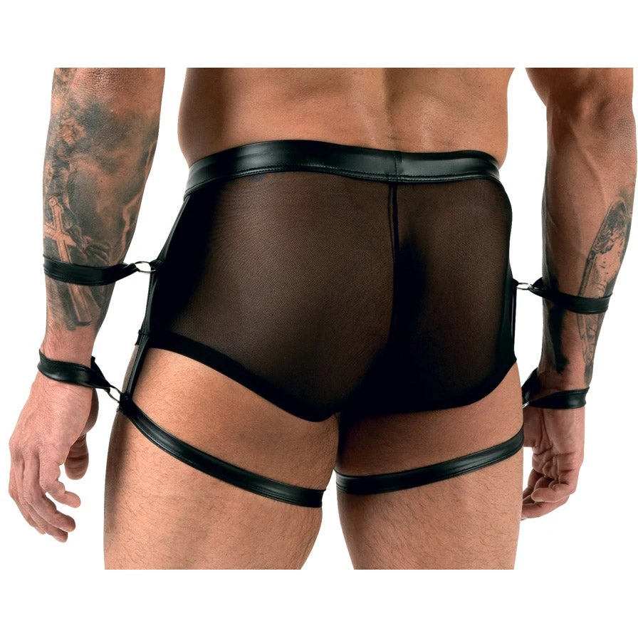 An exclusive, captivating design! Black pants from Svenjoyment Bondage made out of transparent powernet combined with beautiful matte look material. Tight-fitting but stretchy for a comfortable fit. The pouch has press studs which means that it can be opened erotically. There are two rings at either side with handcuffs and arm loops attached to them – the arm loops are attached to the pants and the handcuffs are attached to the thigh straps. The restraints are removable and have hook and loop fasteners.