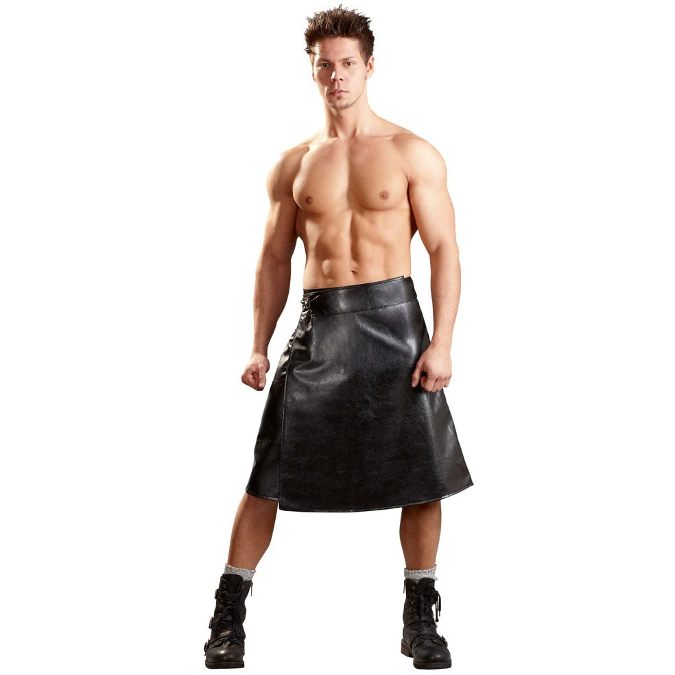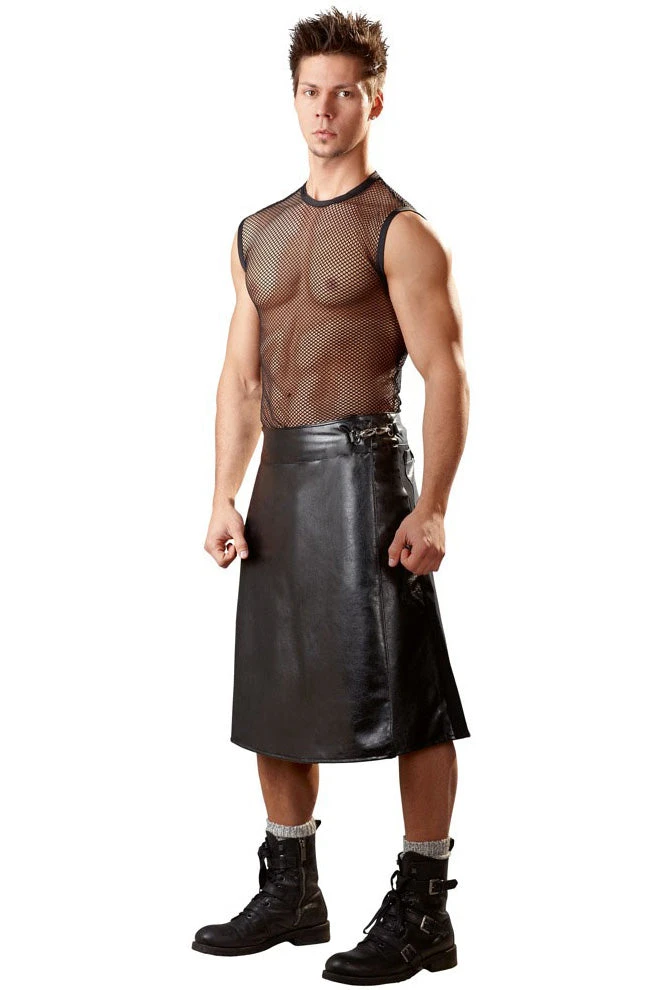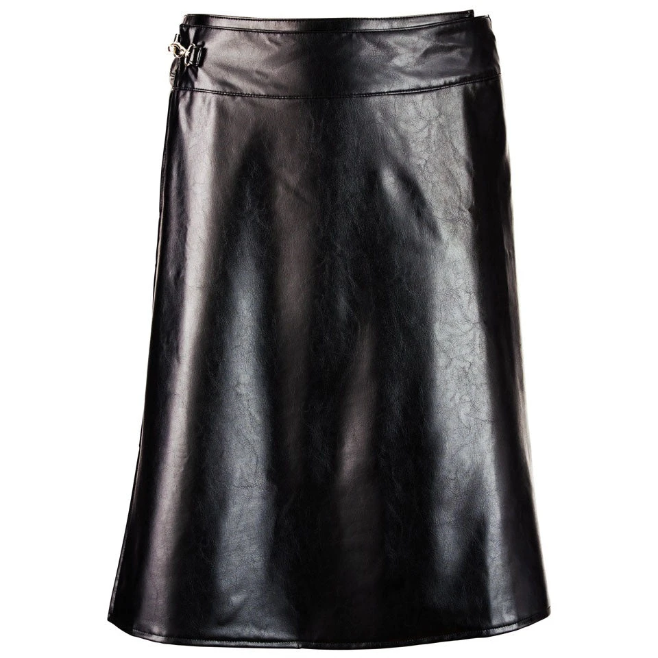 Knee-length wrap skirt/Kilt in a mix of leather imitation (front) and thick woven fabric (backside). The pleat on the back looks elegant and offers a certain freedom of movement. With attached press stud pocket.