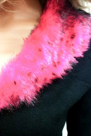 This long sleeve black knit cardigan fastens up the front with black buttons and has a button on detachable collar in neon pink fake fur with black leopard-esque spotted detail.