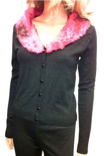 Living Dead Souls – Voodoo Vixen – Black Knit Cardigan with detachable pink and black faux fur collar.